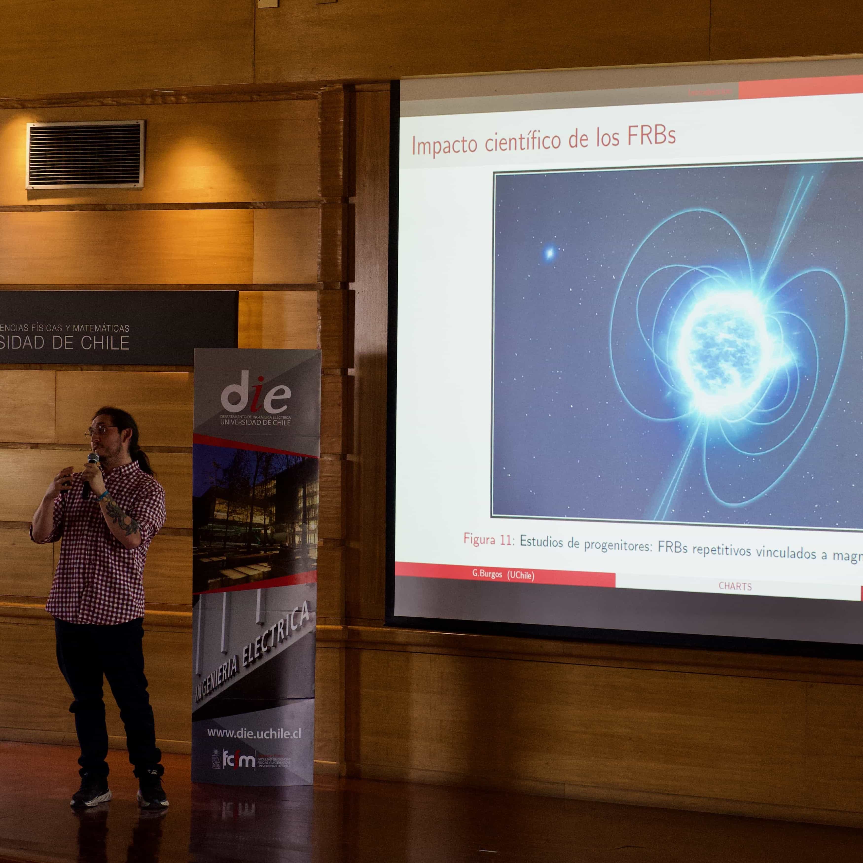 AstroLab Outreach event 2025. In August 2025, AstroLab hosted an outreach event where team members delivered a one-hour presentation on our current research projects at Facultad Ciencias FĂsicas Matemáticas, Universidad de Chile. Students from AstroLab showcased their work to peers, sparking lively discussion and questions. The session emphasized open, friendly dialogue about our investigations and career paths in astronomy and instrumentation. Stay tuned for announcements about upcoming outreach events! The photograph shows our team member MSc. Gonzalo Burgos whiule discussing the transient radio sky.